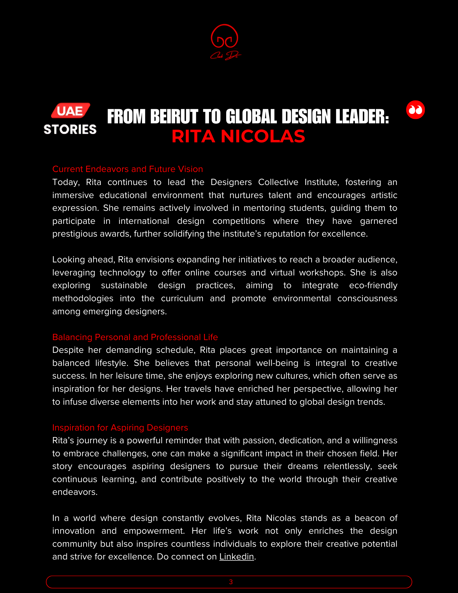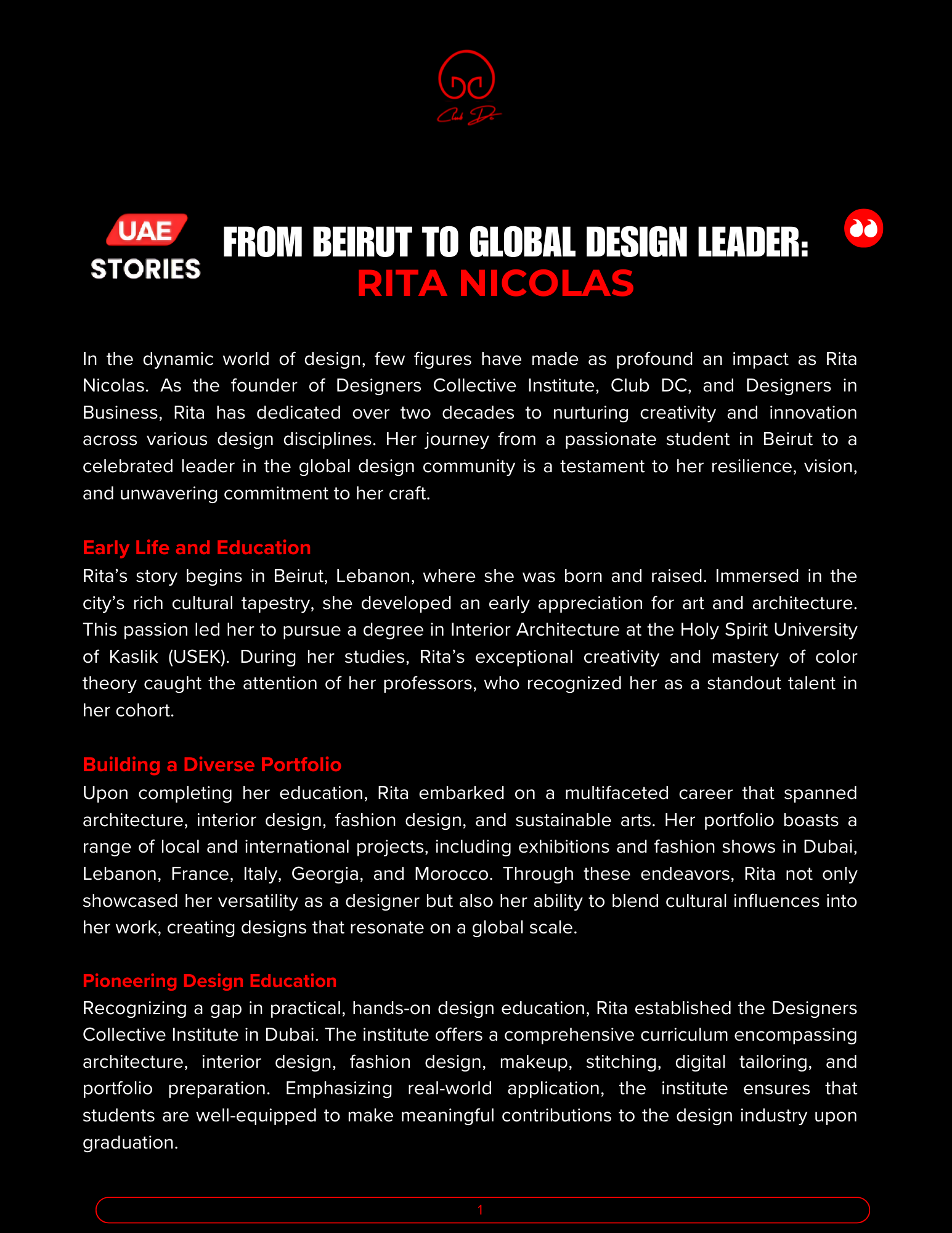 News & Updates The success story of Rita Nicolas in UAE 15/03/2025 | by hichamnicolas | 0 Comments | 0 Likes https://www.instagram.com/p/DHG3P61znuG/?hl=en&img_index=1 🎓 Want to learn more? Explore all our design courses at Designers Collective Institute → Also read: A beautiful reminder from Ms. Rita Hands on learning only at Designers Collective Institute Amazing classes to join
